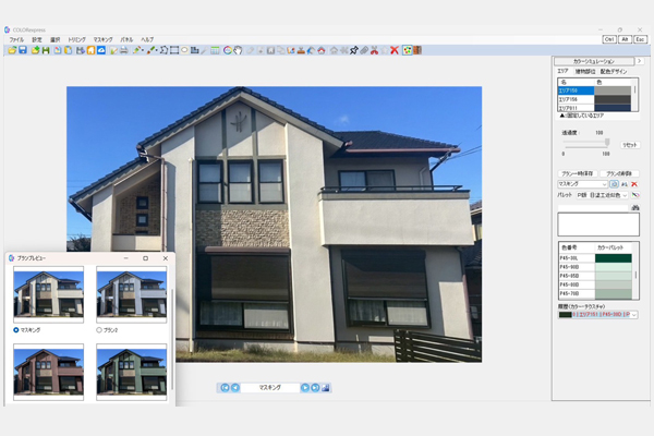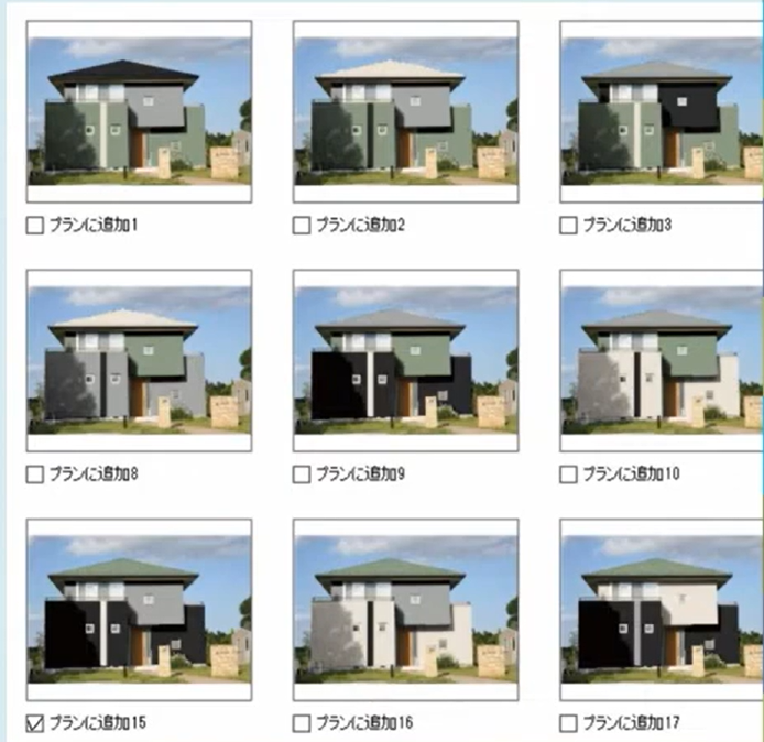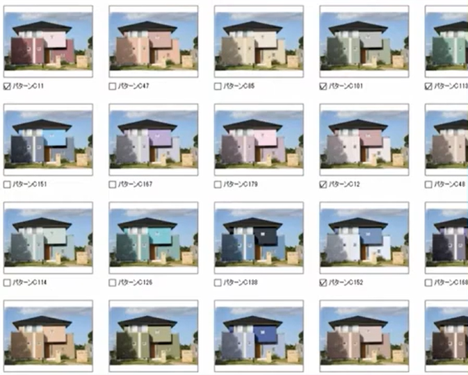 プロのカラーコーディネーターが監修した1,260通りの配色プランの中から、建物の形状に合ったデザインを一覧で確認できます。