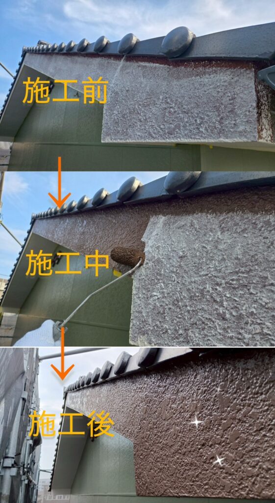 破風板色褪せが見受けられ、紫外線が当たりやすい場所は塗膜が劣化していました。下地調整を施し、補修跡が目立たないよう丁寧に仕上げています。