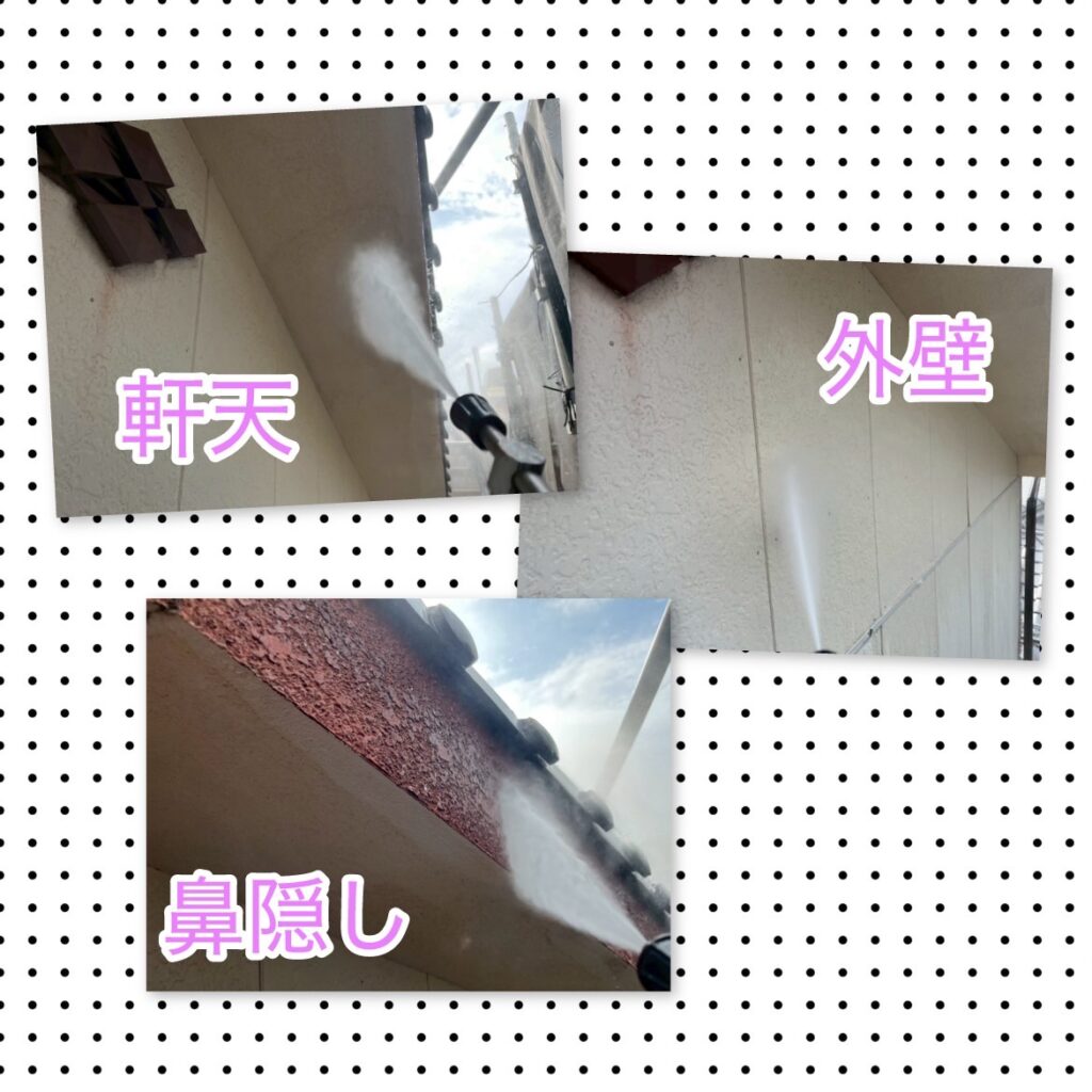 〇高圧洗浄:外壁に付着したチョーキングや汚れを、高圧洗浄機を使用してしっかりと除去。