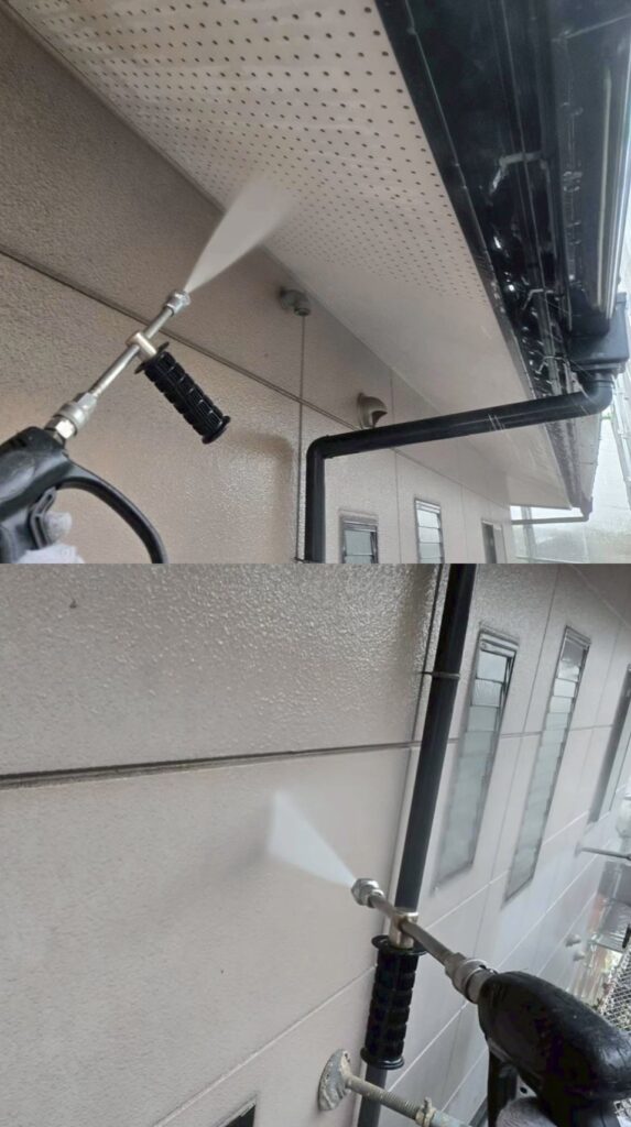 外壁のチョーキングが見られたため、高圧洗浄でしっかりと汚れや劣化塗膜をしっかり除去しました。